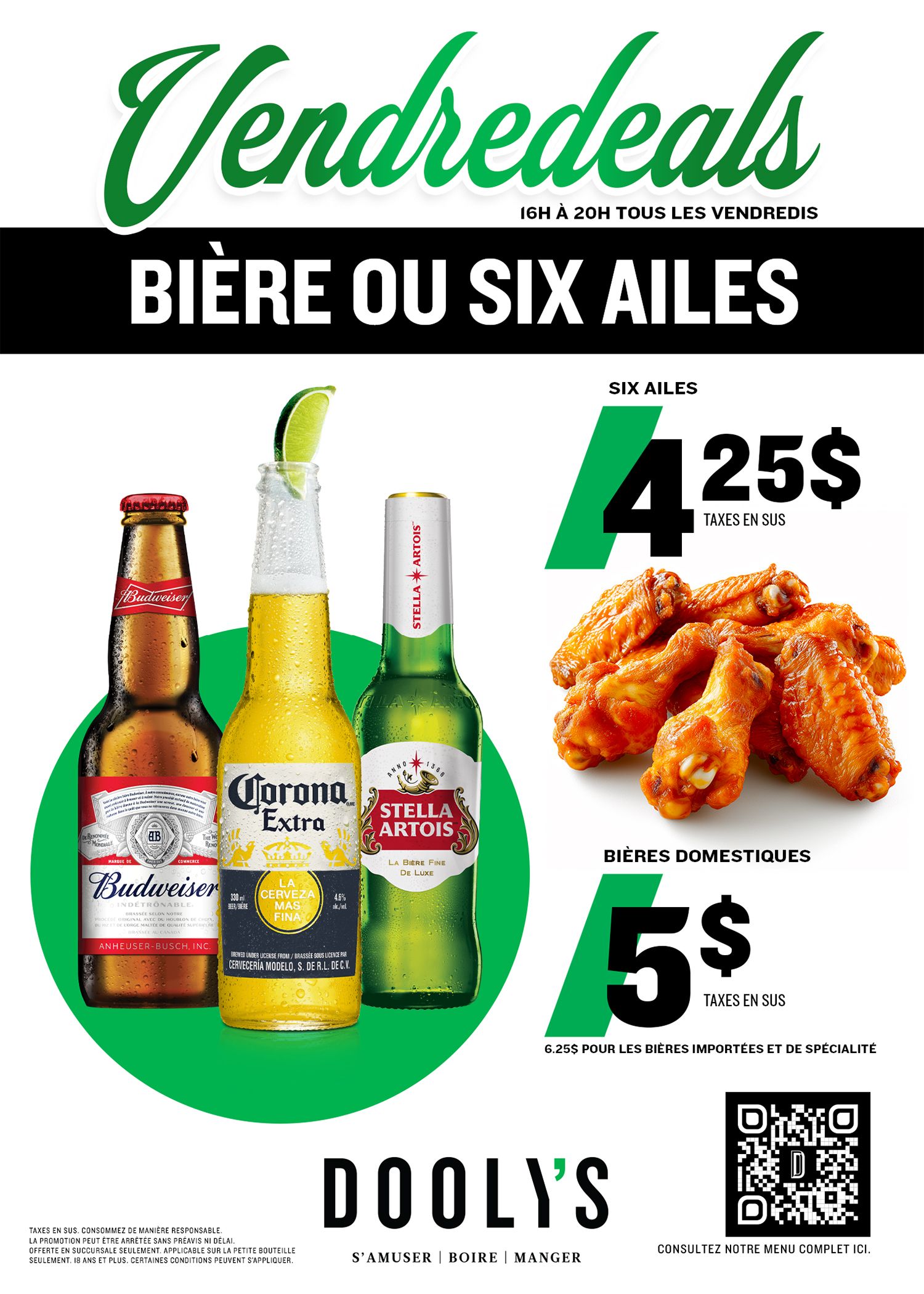 Bière domestique à 5.00$ +tx ou six ailes à 4.25$ +tx