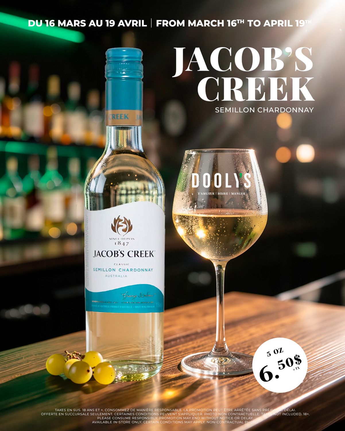Verre de 5oz de Jacob’s Creek blanc: 6.50$ +tx