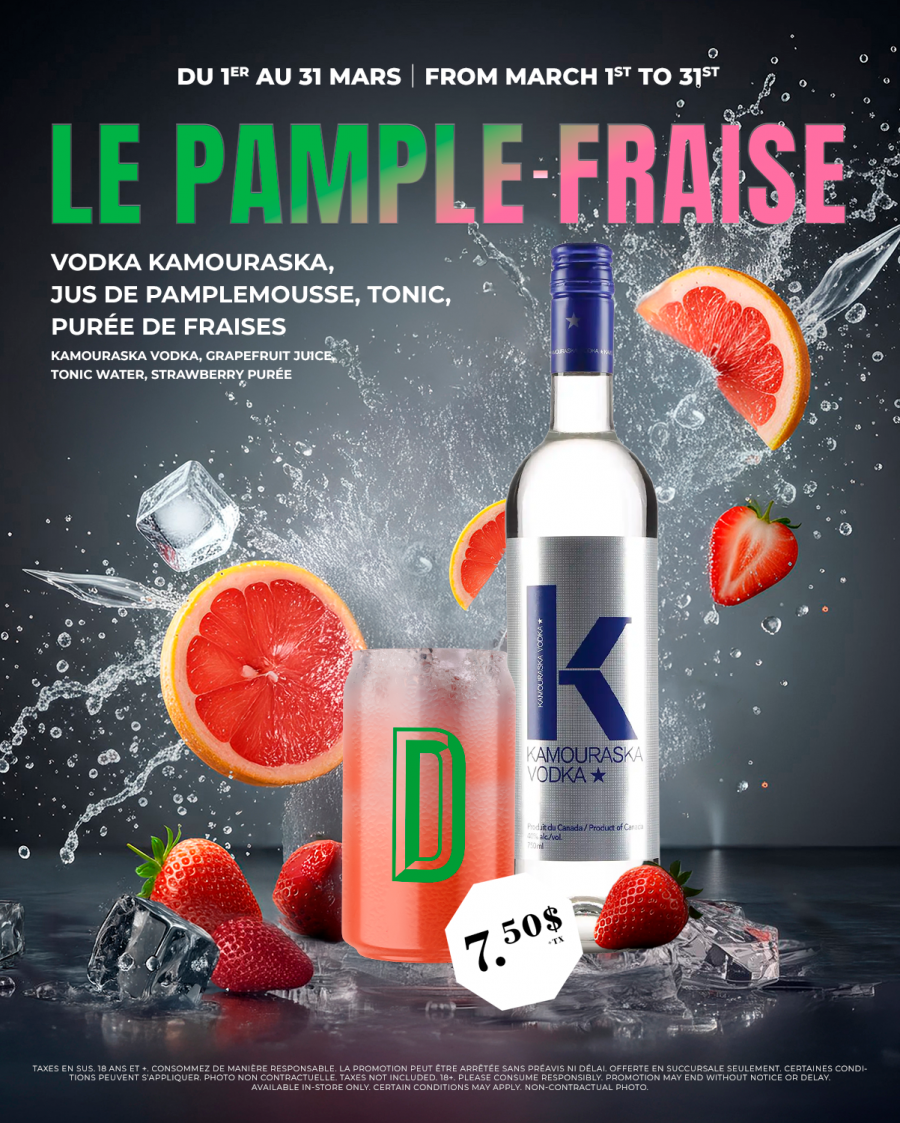 Vodka Kamouraska, jus de pamplemousse, tonic et purée de fraise: 7.50$ +tx