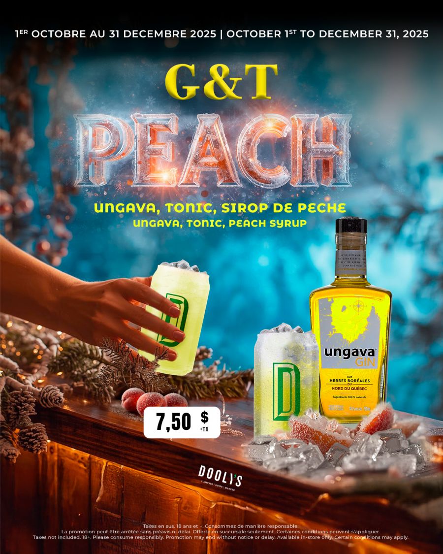Gin Ungava, tonic et sirop de pêche 7.50$ + tx