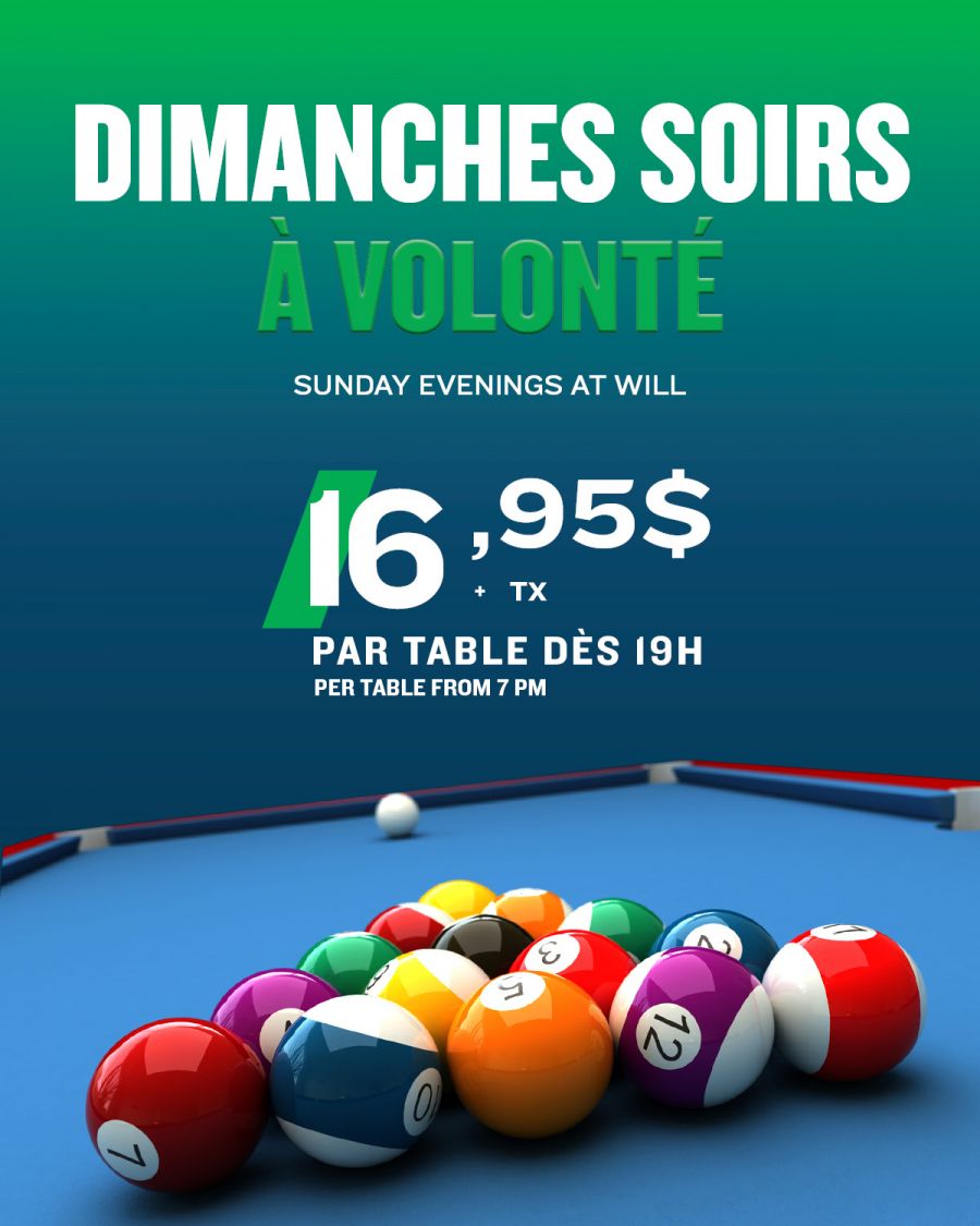 16.95$ + tx la table dès 19 heures tous les dimanches soirs