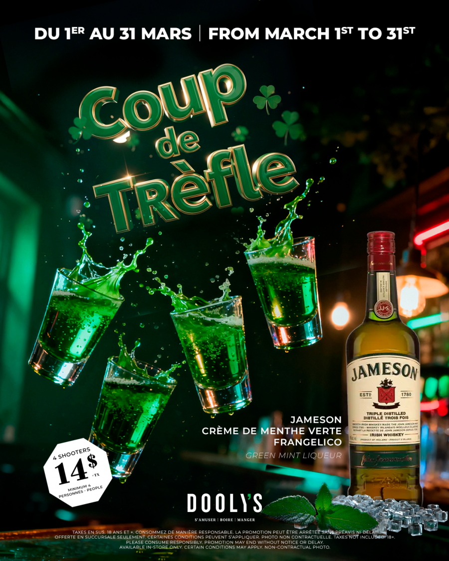 Jameson, crème de menthe verte et Frangelico: 4 pour 14$ +tx
