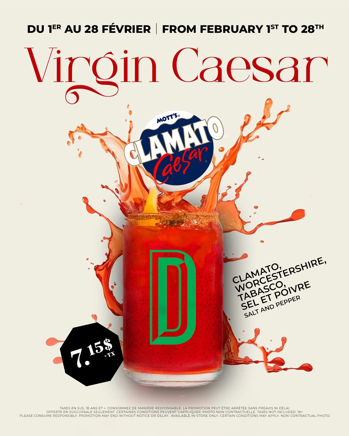 Du 1er au 28 février 2026: Clamato, Worcestershire, Tabasco, sel et poivre. 7.15$