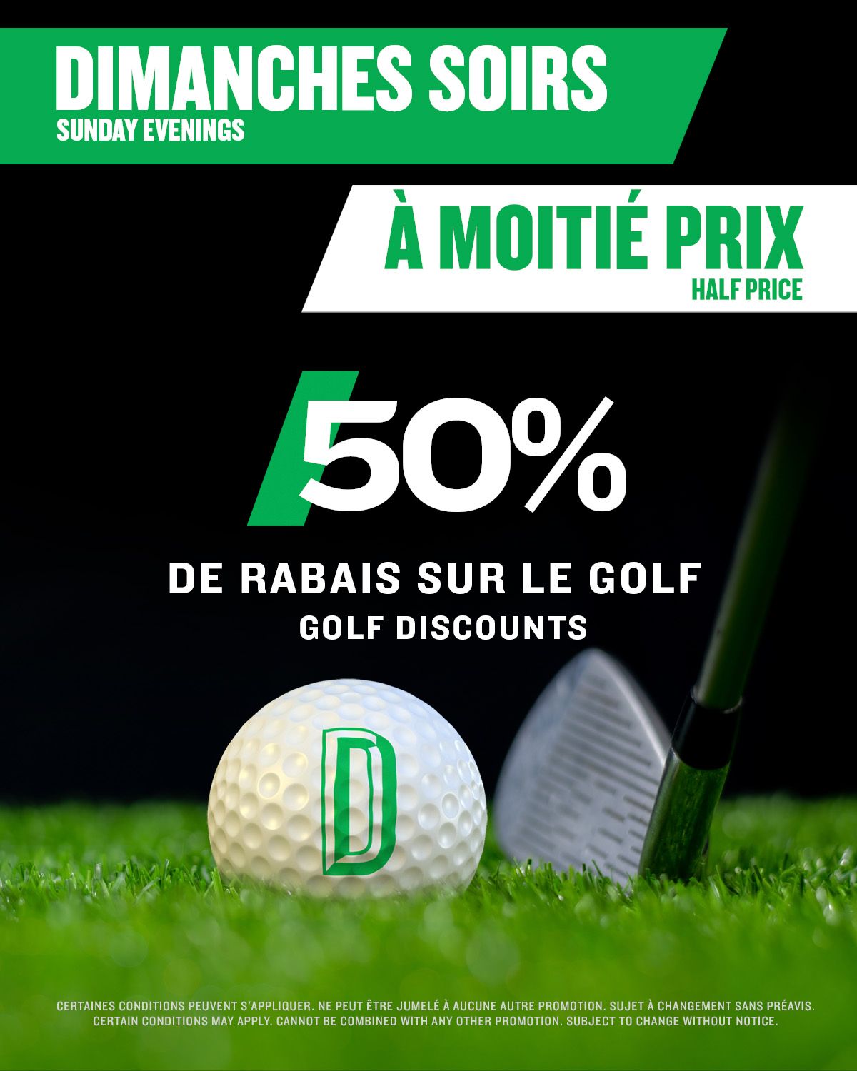 50% de rabais sur le golf / dès 19 heures tous les dimanches
