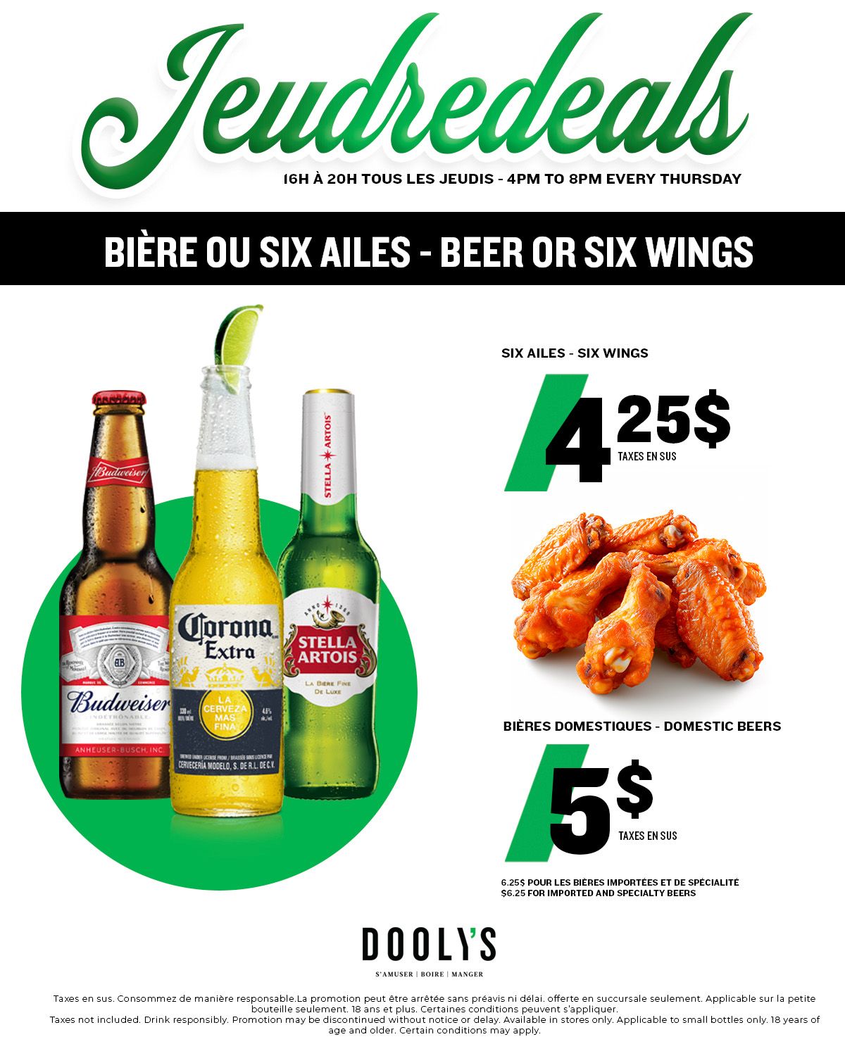 Domestic beer: $5.00 + tax or six wings: $4.25 + tax