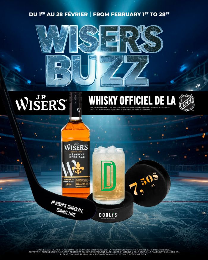 JP Wiser’s, ginger ale et cordial lime. 7.50$