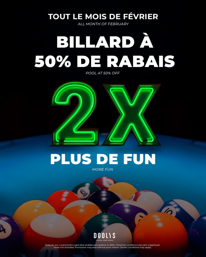 Dès 19h tous les jeudis. 2 heures de billard et un pichet de bière 27.50$+tx.