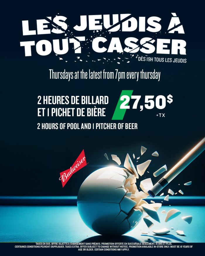 Dès 19h tous les jeudis. 2 heures de billard et un pichet de bière 27.50$+tx.